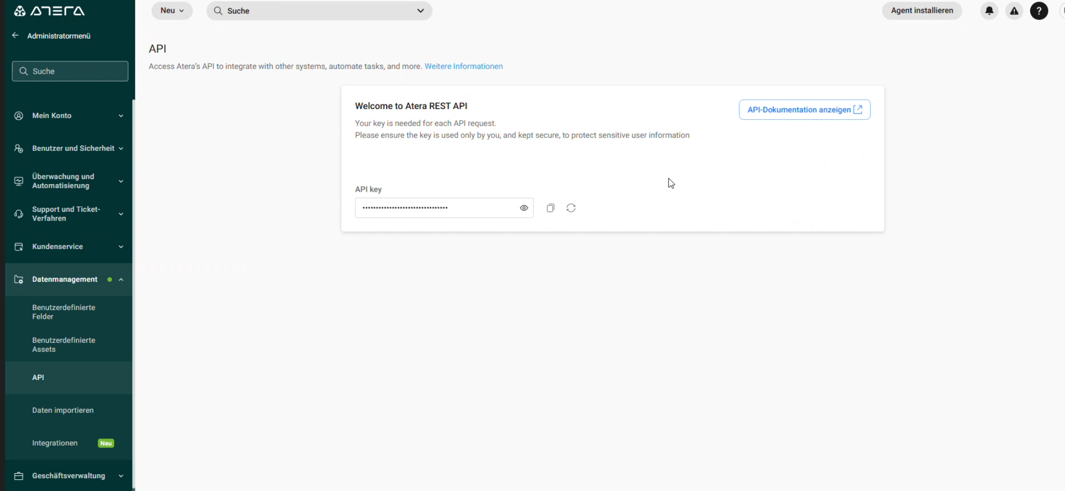 Zunächst müssen Sie in Atera einen neuen API-Key erstellen, die venabo den Zugriff auf Ihre Monitoring-Daten ermöglicht.