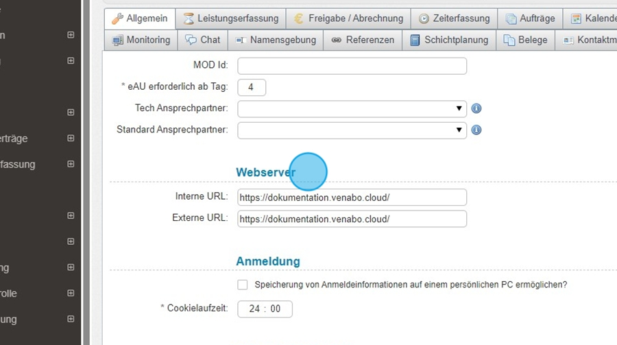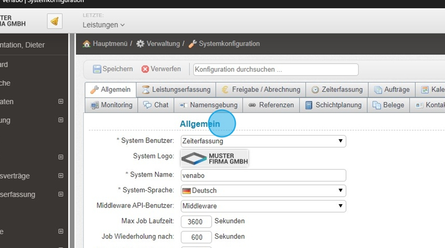 Der Reiter „Allgemein“ bündelt die wichtigsten Grundkonfigurationen Ihres venabo-Systems. Von der Definition eines Standardbenutzers über die Anpassung Ihres Firmenlogos bis hin zu Such- und Sicherheitsfunktionen – hier legen Sie die Basis für einen reibungslosen Systembetrieb.