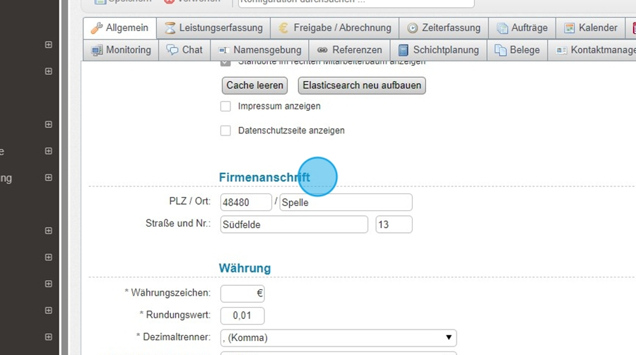 Im Unterpunkt „Firmenanschrift“ können Sie Ihre Unternehmensadresse hinterlegen. Diese Angaben werden in verschiedenen Modulen verwendet, z. B. bei E-Mail-Vorlagen, Rechnungen oder Berichten. Achten Sie darauf, dass die Daten korrekt und vollständig sind, um fehlerhafte Kommunikation zu vermeiden.