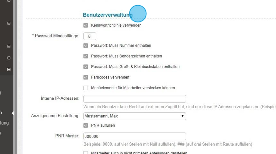 Im Bereich „Benutzerverwaltung“ können Sie Sicherheitsrichtlinien und Darstellungsoptionen für Benutzer festlegen: