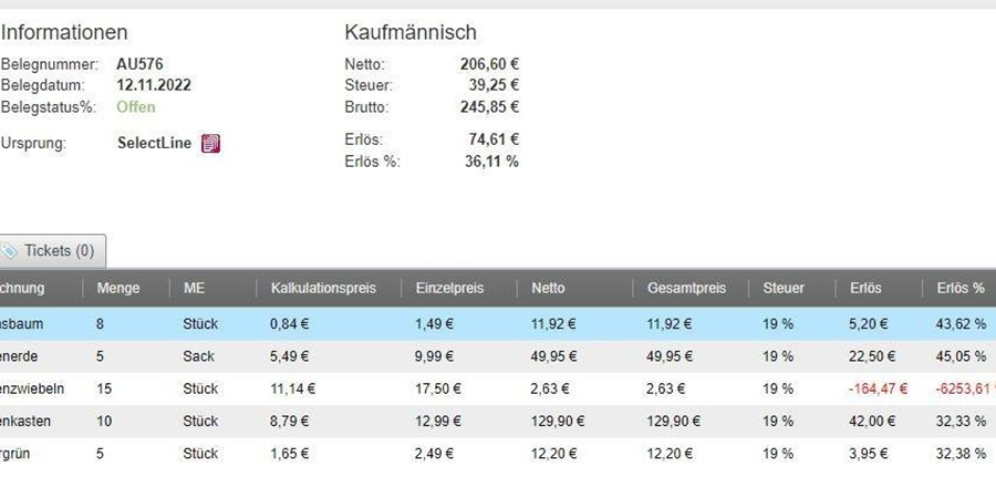 Darstellung: Wird der Erlös eines Belegs unterhalb dieser Schwelle berechnet, wird der entsprechende Wert in roter Schrift angezeigt, um Sie visuell auf kritische Werte aufmerksam zu machen.