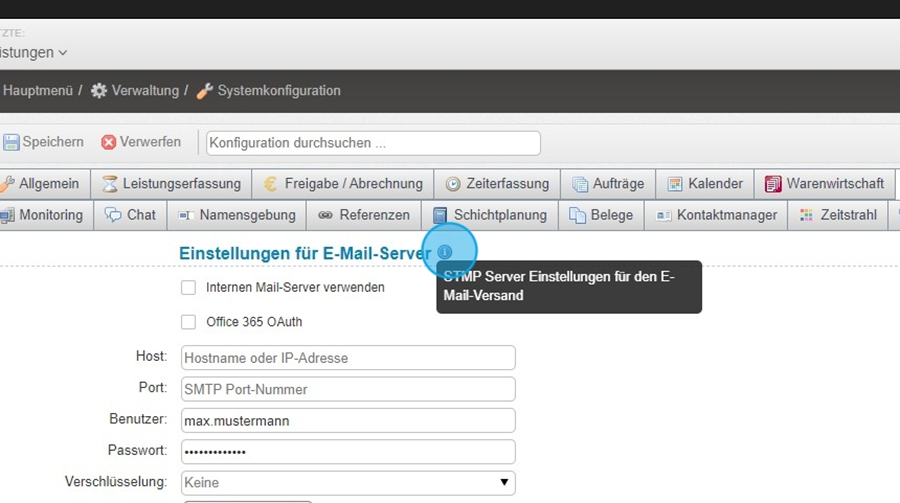 In diesem Bereich definieren Sie, über welchen Server E-Mails aus dem System versendet werden.