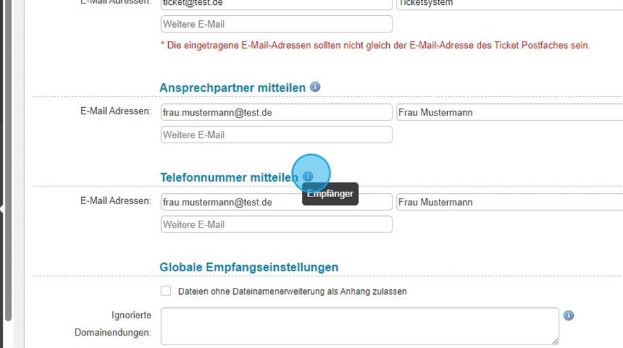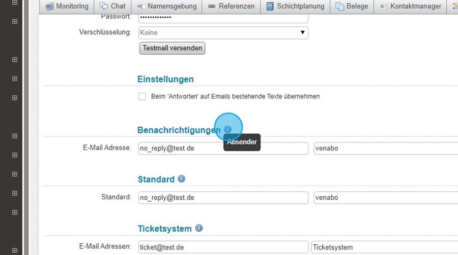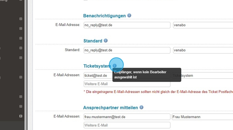 Hier definieren Sie E-Mail-Einstellungen speziell für das Ticketsystem.