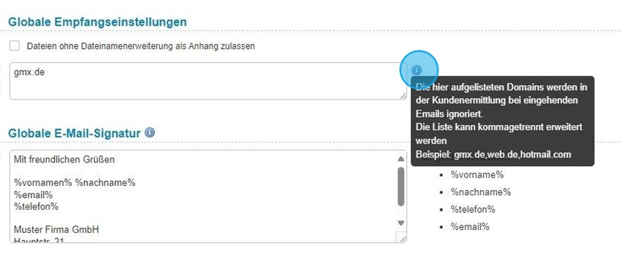 Hier können Sie Domain-Endungen definieren, die bei der automatischen Kundenermittlung aus eingehenden E-Mails ignoriert werden.
