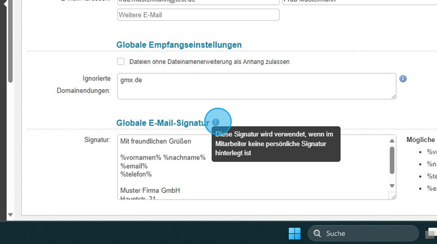 Am Ende des Reiters finden Sie die Möglichkeit, eine globale E-Mail-Signatur zu hinterlegen.