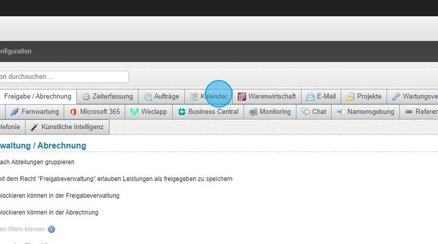 Wählen Sie hier den Unterpunkt „Systemkonfiguration“, um zu den allgemeinen Systemeinstellungen zu gelangen. - Nach dem Öffnen der Systemkonfiguration wechseln Sie zum Reiter „Kalender“.