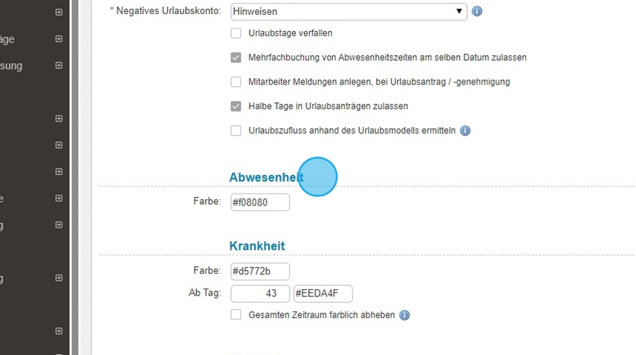 Diese Farbe wird systemweit angezeigt, z. B. im Mitarbeiterkalender oder bei Urlaubsübersichten, und erleichtert die visuelle Unterscheidung von Abwesenheiten. - Negatives Urlaubskonto:
