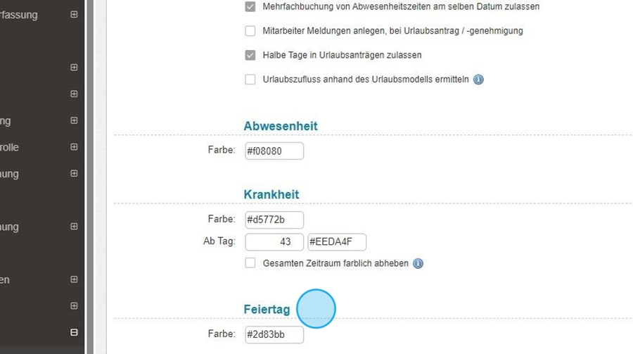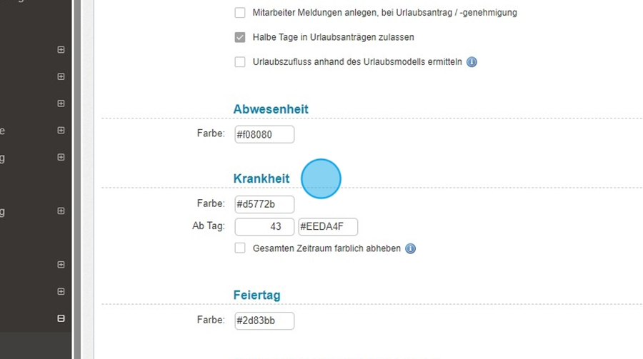 Bestimmen Sie eine Standardfarbe für Krankmeldungen, um diese im Kalender deutlich hervorzuheben. - Ab Tag: