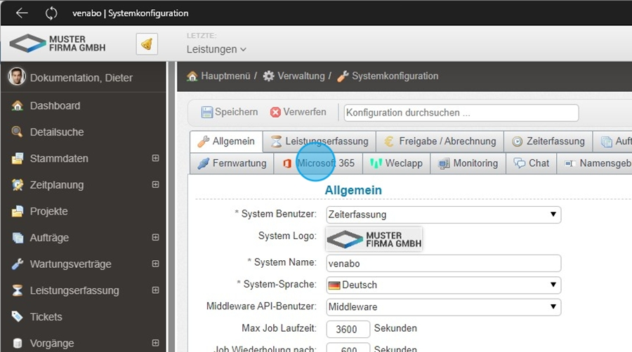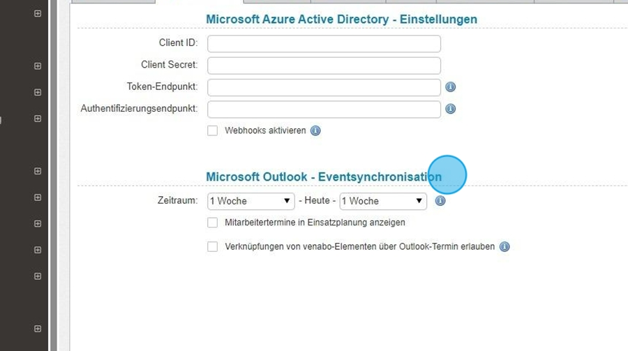 - Hinterlegen Sie die entsprechenden Konfigurationsdaten aus M365 in venabo (z. B. Tenant-ID, Client-ID, Secret).