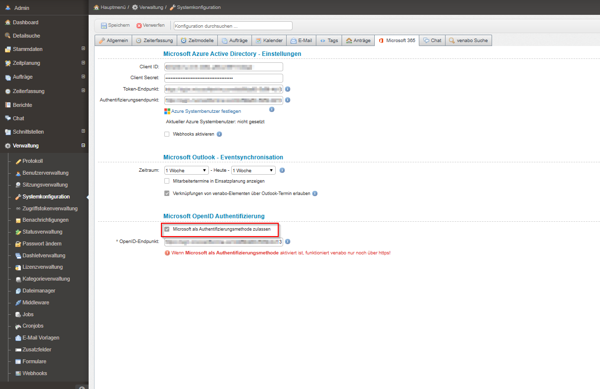 - Öffnen Sie venabo und navigieren Sie zu Systemkonfiguration → M365.